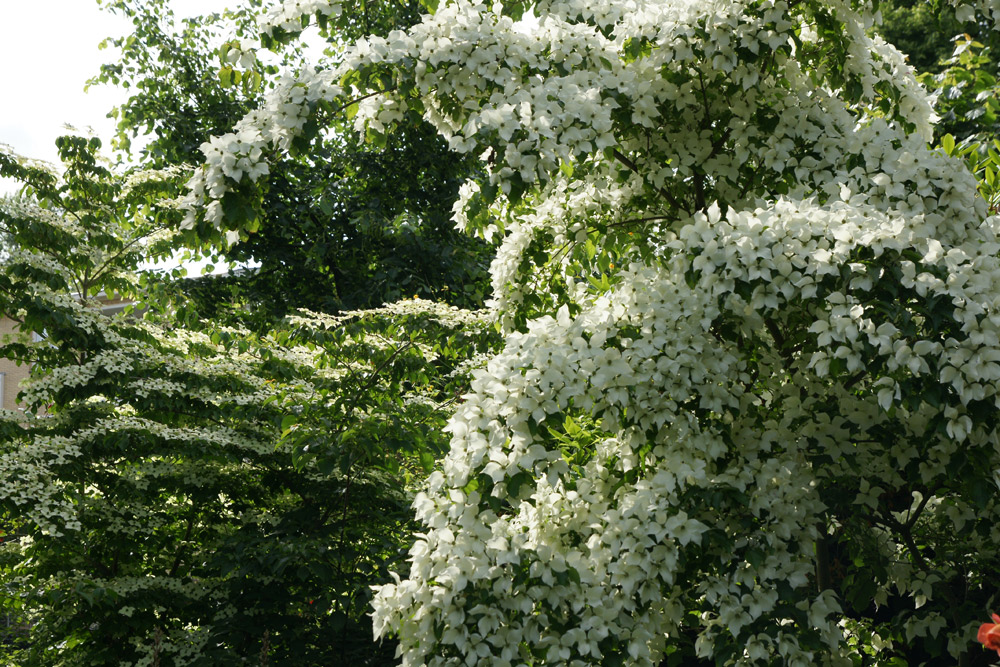 Ik twijfel. Ik heb ook schitterende Magnolia’s en Camelia’s, maar mijn Kornoelje is misschien toch wel de mooiste struik in mijn tuin. Hij bloeit nu, en hij is een imponerende struik met vrachten witte bloemen. Vorig jaar strekten de takken zich zover uit dat hij ze als steuntje maar neerlegde op de Rodondendron daarachter. Nu kun je de hele Rodo door alle bloementakken niet meer zien, maar die is toch eigenlijk niet zo mooi. Hij maakt dus lange takken tjokvol bloemen. Wit, maar er bestaat ook een vaag-roze soort. Ik heb liever de mijne.