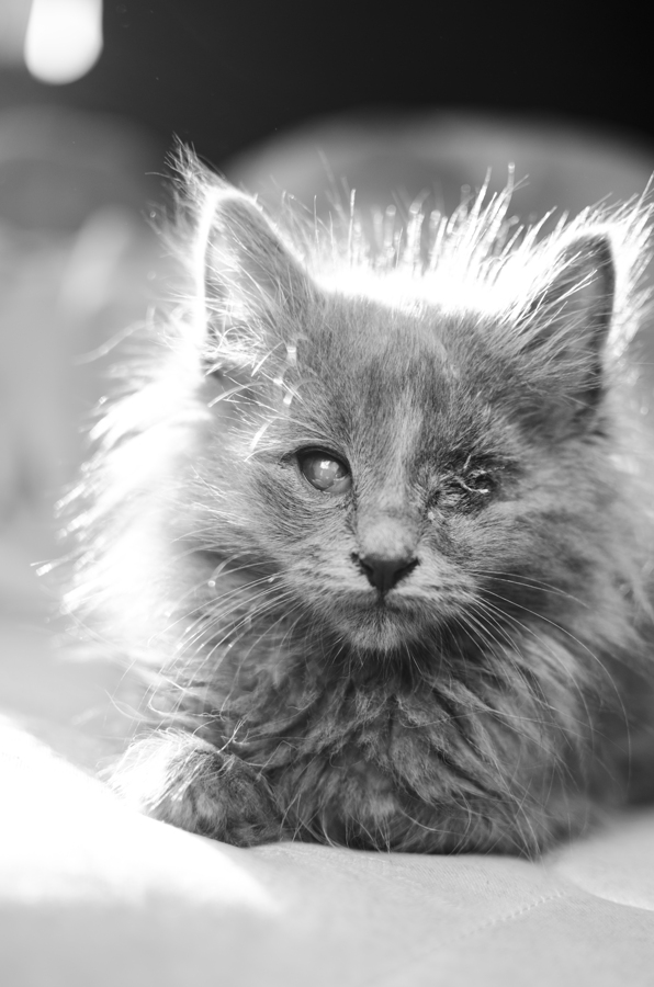 Ik spring op en ongerust over de kat, ren ik achter hem aan. ‘Wat is er met zijn oog dan?’