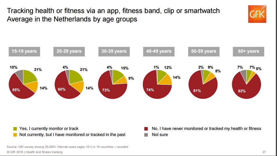 De Nederlandse resultaten per leeftijdsgroep zijn best komisch: de jongste bewoners in het onderzoek willen dagelijks wel weten hoe het ervoor staat, maar wij senioren zijn toch een stuk minder geïnteresseerd. Terwijl wij het misschien wel het hardst nodig hebben. Misschien omdat we niet zo bezig zijn met moderne apparaatjes of misschien omdat in de jongeren-groep een epidemie van gezondheidsverslaving heeft toegeslagen.