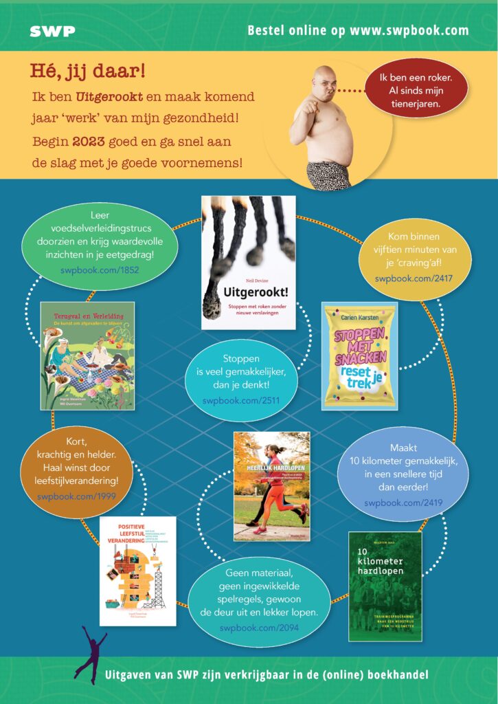 Stoppen met roken, stoppen met snacken, beginnen met hardlopen of werk maken van leefstijlverandering? Met welk goede voornemen ga jij in 2023 aan de slag? De volgende boeken kunnen ervoor zorgen dat jij in 2023 wél afrekent met een ongezonde gewoonte. Stap voor stap word je op een verantwoorde manier op weg geholpen, zodat je wél kunt volhouden.